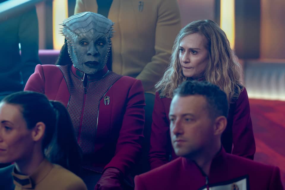 Gina Yashere as Lura and Holly Hunter as Nahla in Star Trek: Starfleet Academy, episode 4, season 1, streaming on Paramount+, 3035. Photo Credit: Brooke Palmer Paramount+